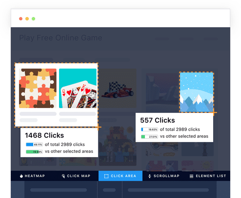 Record visitor data on the live state of your website. Easily view behavior on elements like modal boxes, pages behind logins, and dynamic URLs. The navigation mode lets you browse different pages on your website while viewing the visitor data on each element of these pages.