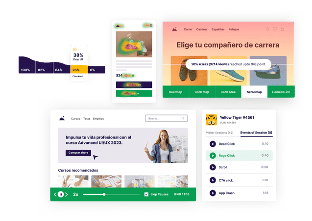 Examina más de cerca los recorridos digitales de los usuarios e identifica los obstáculos de conversión utilizando heatmaps, grabaciones de sesiones, embudos, análisis de formularios y encuestas.