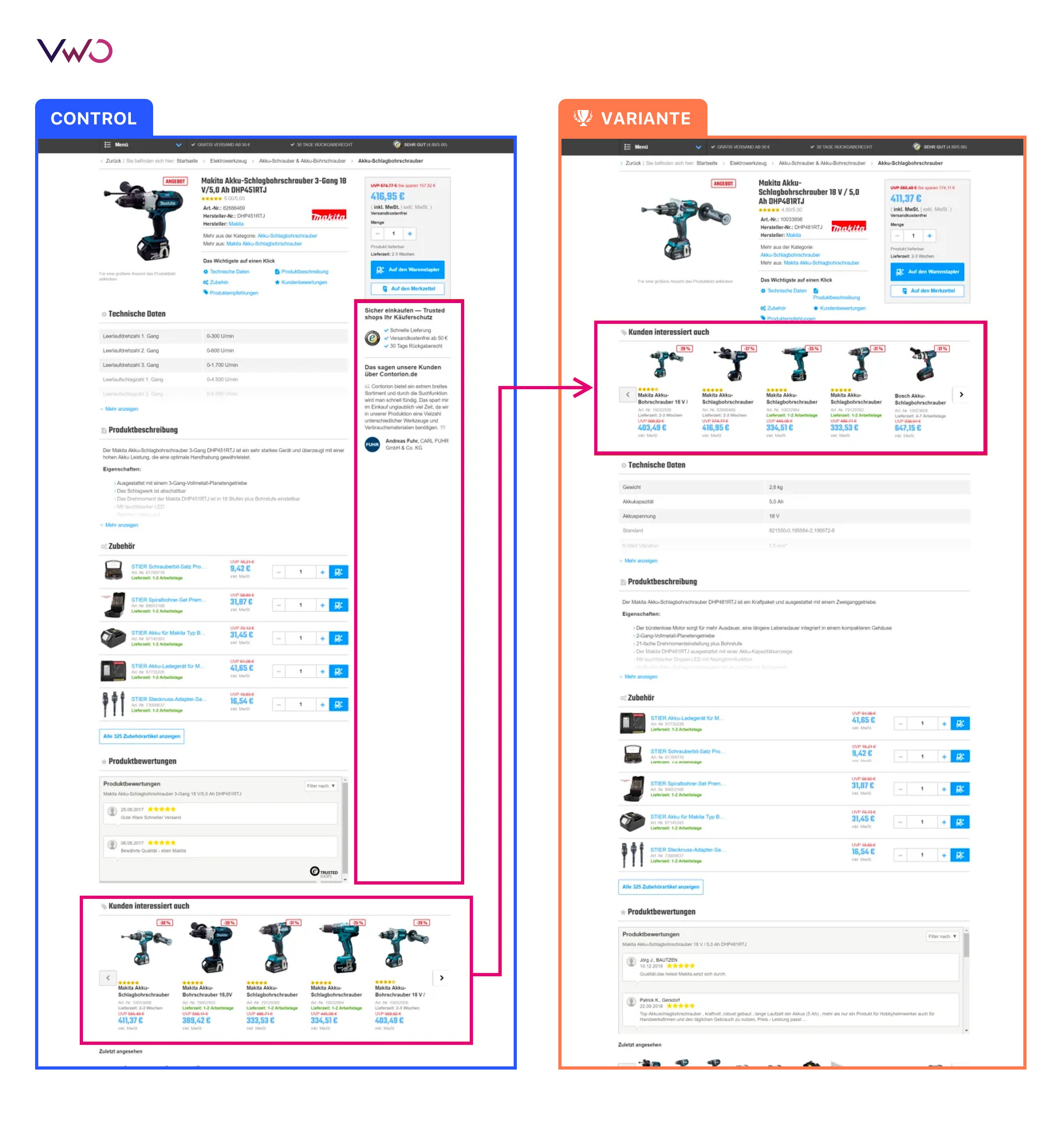 – Testvariante: Die Trust-Elemente unter dem Warenkorb-Button verschwanden. Dafür entstand mehr Raum für die Produktinformationen. Die Empfehlungen erschienen weiter oben auf der Seite.