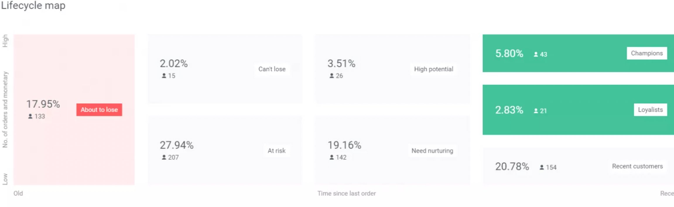 With the insights you’ve gathered, plot them against where your customers are at in their customer journey. Tools like Omnisend have built-in customer lifecycle features that help you understand which of your customers are in any particular stage—such as “high potential,” “loyalists,” and even “about to lose.” This overview is based on the data you’ve collected.